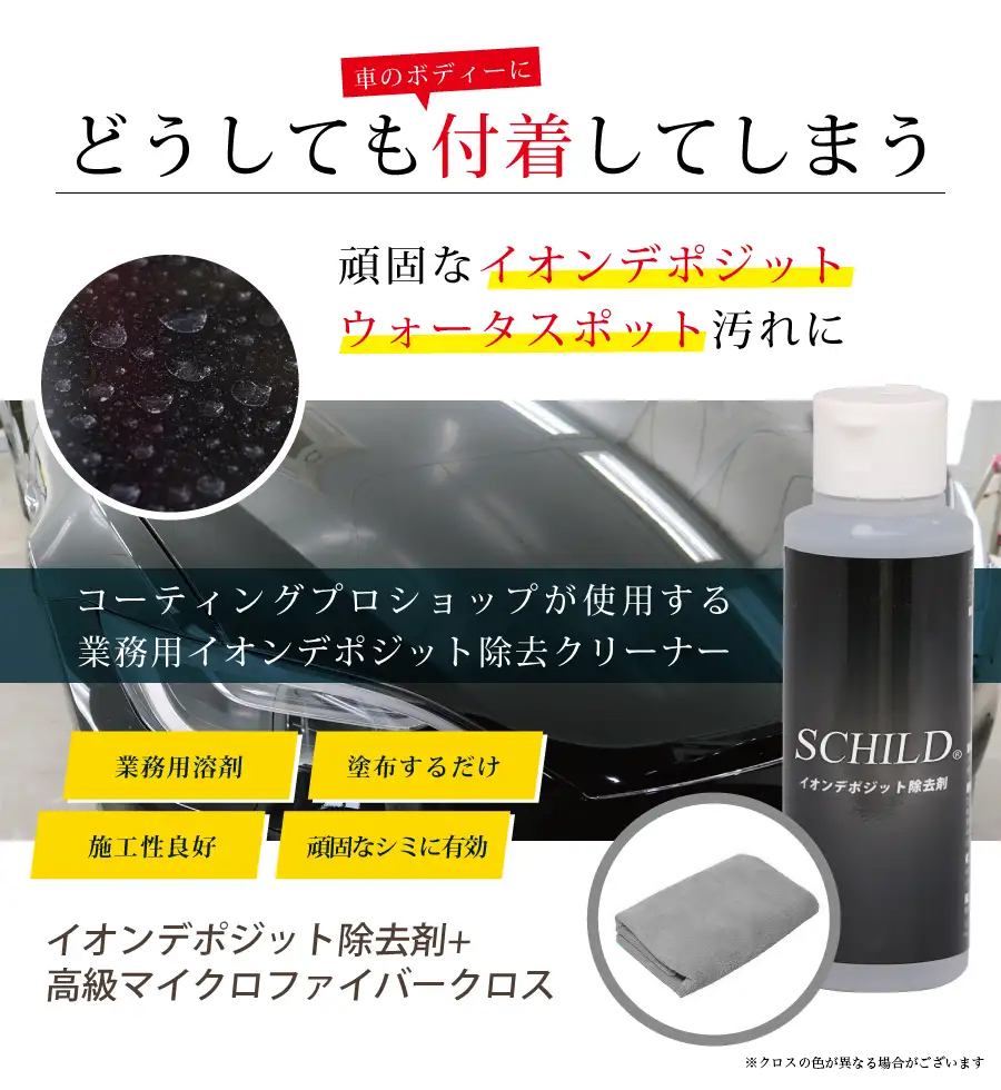SCHILDの業務用イオンデポジット除去剤は初心者の方でも安心してご利用頂ける製品です。塗装面に付着したイオンデポジットや雨染みを簡単に取り除くことが可能となります。