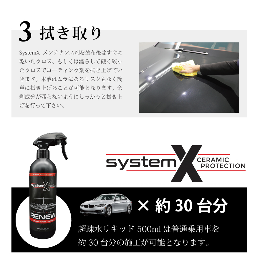 SystemXメンテナンス剤を塗布後はすぐに乾いたクロス、もしくは濡らして硬く絞ったクロスでコーティング剤を拭き上げていきます。本液はムラになるリスクもなく簡単に拭き上げることが可能となります。余剰成分が残らないようにしっかりと拭き上げを行って下さい。