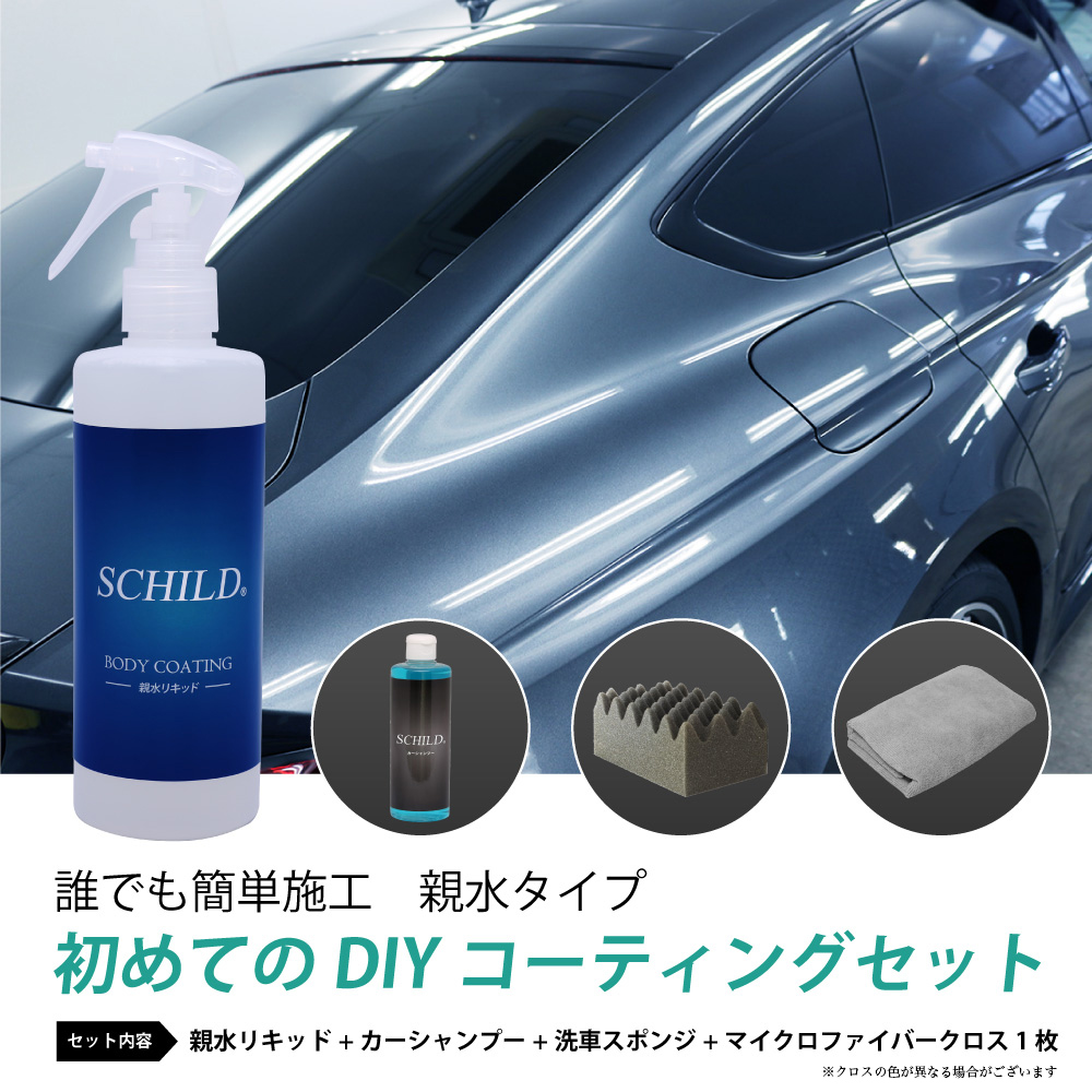 IICショップではDIYカーコーティング「親水性」4点セットをお求めやすい価格でご用意致しました。セット内容は、カーシャンプー300ml+親水リキッド290ml+マイクロファイバークロス+洗車スポンジが含まれます