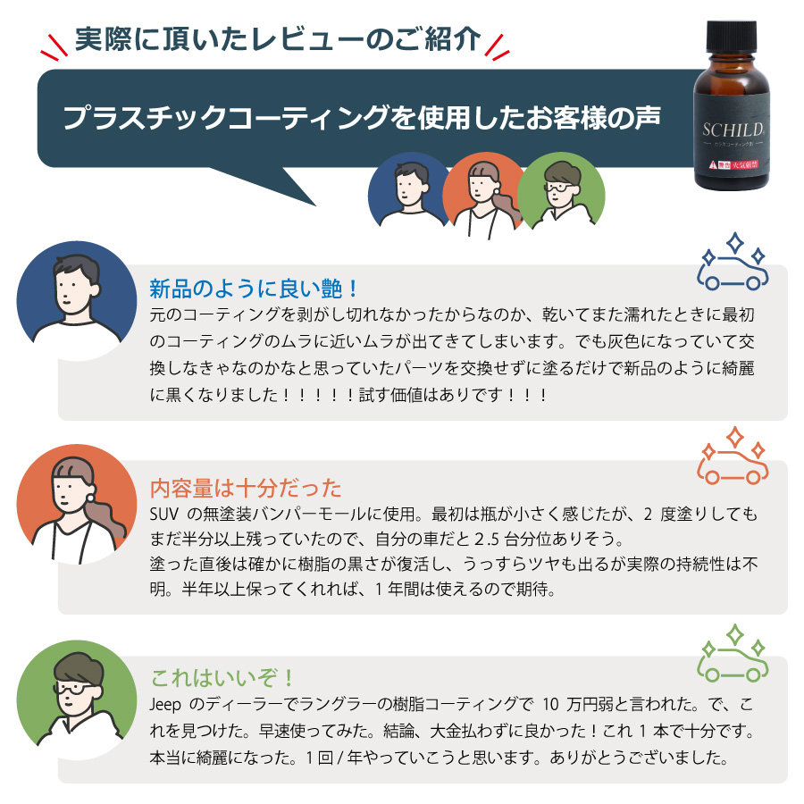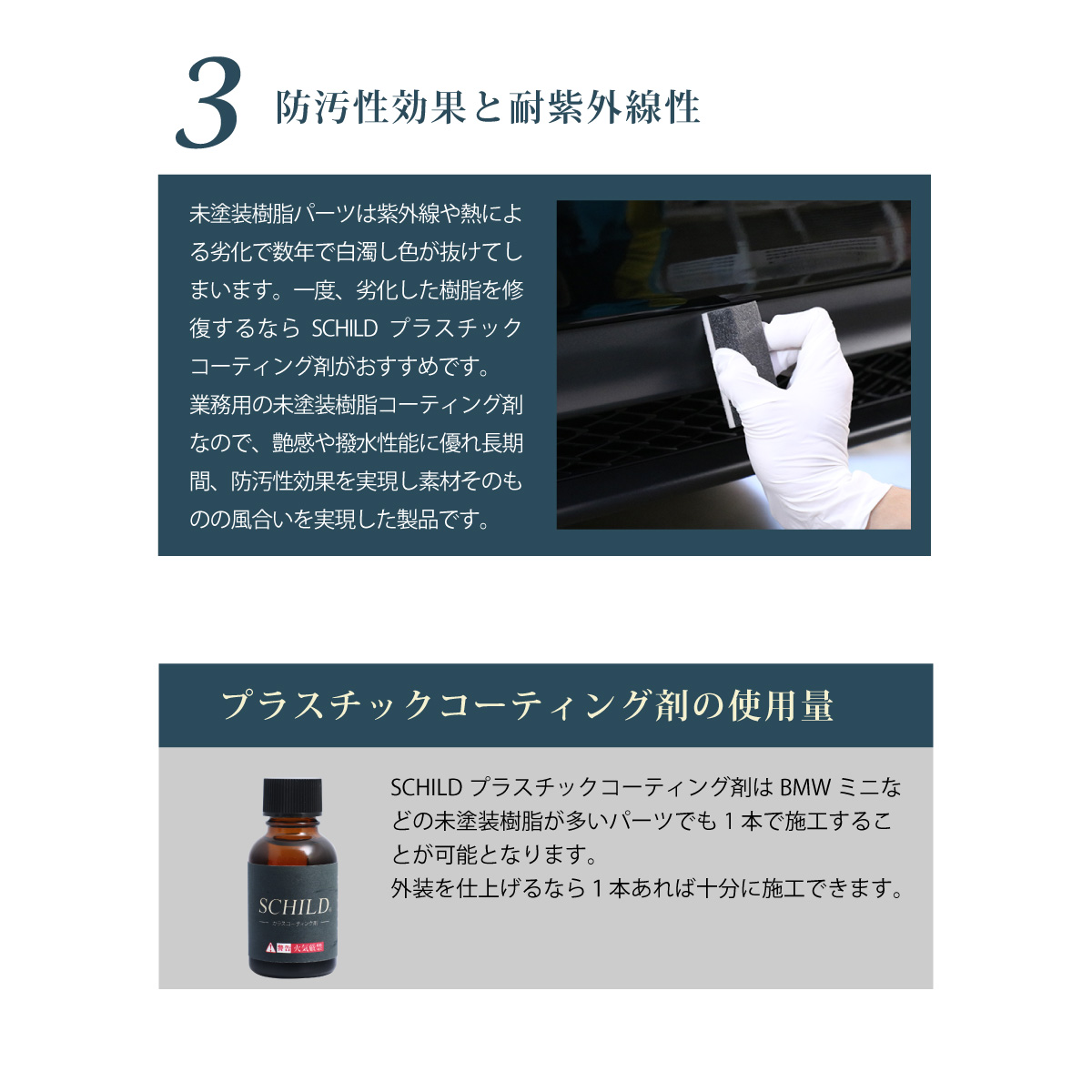 SCHILDプラスチックコーティング剤は自動車の樹脂パーツ(未塗装樹脂パーツ)専用のコーティング剤となります。